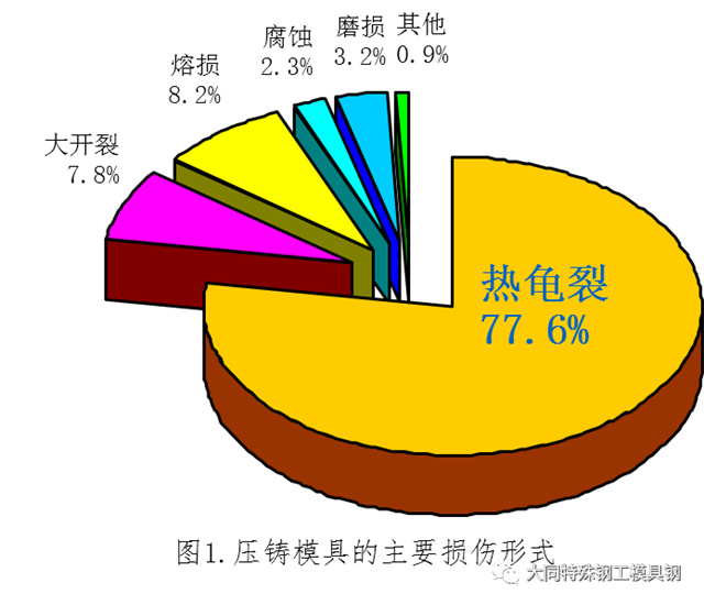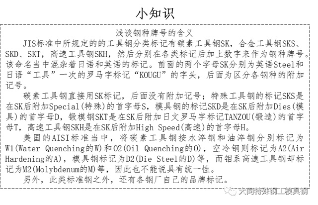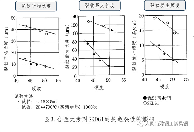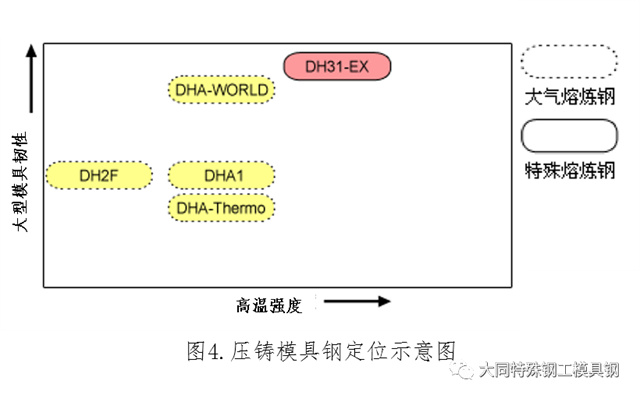 此外,减少Si含量有助于提高冲击韧度。这是因为熔炼-凝固时生成的粗大碳化物含量随含Si量降低而减少,其结果促进了碳化物的微细化和组织均匀化,从而使韧性和耐热龟裂性得到改善。 另外,增加含Mo量可提高淬透性和改善高温强度,适用于要求寿命长以及承受高负荷的大型压铸模具。 近年,薄壁件的成形也采用真空压铸和各种组合件的一体化成形,造成模具复杂化、大型化,因而对模具材料的淬透性也有了更高的要求。另外,为提高成形效率,有通过强化模具内部冷却而力求缩短成型周期的趋势,因此,冷却水孔增多且与模具表面的距离缩小,这就需要韧性更高的材料。因此,高性能高可靠性的模具材料越发显得重要。敝司为应对市场需求,开发并推出DHA-WORLD、DH31-EX等通过提高淬透性来改善大型模具心部韧性的钢种,并已作为北美压铸协会(NADCA,Noreth American Die Cast Associaton)标准的推荐钢种得到登记。